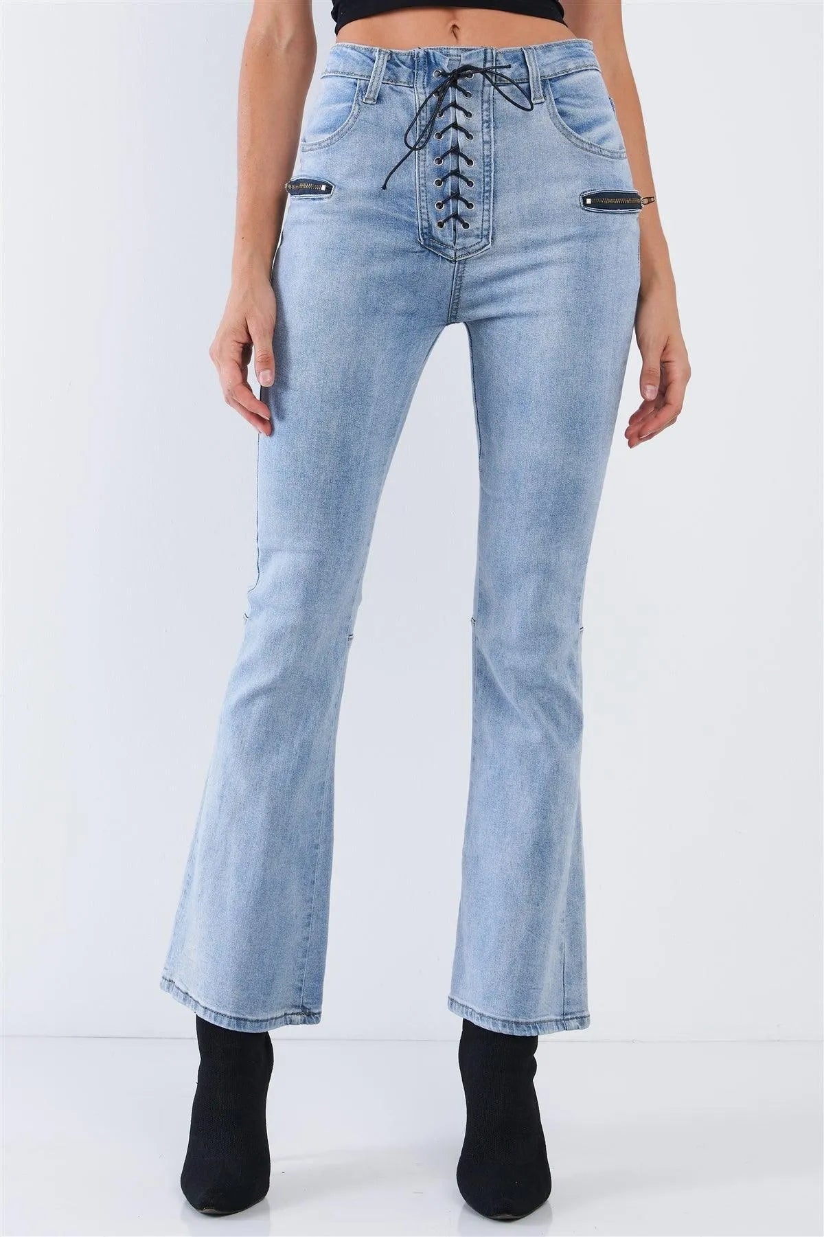 High Waisted Light Blue Denim Lace Up Fly Zipper Pocket Bell Bottom Jeans